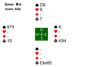 Øst var skvist! Hun hadde ikke råd til å kaste hverken spar eller kløver. Aktuelt kastet hun en kløver. Da kunne Stine spille kløver til knekten og ta for kløver ess, for så å få siste stikk på kløver 8.