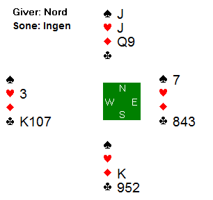 Spillet gikk ut ved det andre bordet, der kløver dame falt under esset uten at spillefører brukte en høy kløver fra bordet, og det ikke var noe problem å få tak i 4 kløverstikk.