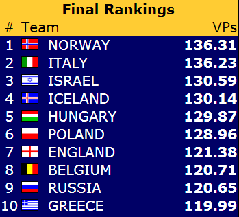Etter 3 fine seire mot Nederland, Spania og Polen, er Norge tilbake igjen på tabelltopp, 0,08 VP foran Italia: