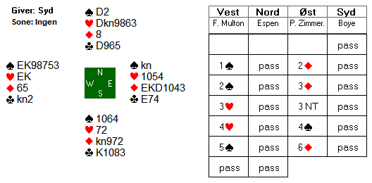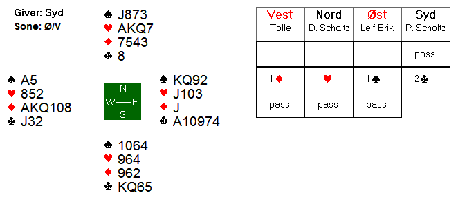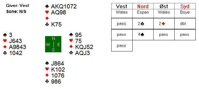 Espen valgte å åpne i 2 kløver på hånden i nord, og da ble det vanskelig for motparten å komme inn. Øst meldte inn 2 ruter, men etter systemet viste dette 4+ spar + en minor. Øst hadde glemt dette, og vest fant aldri ut hvilken minor makkeren hadde, og Espen fikk spille 4 spar for 10 stikk og +620.