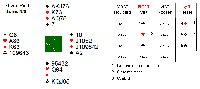 Slik det sitter står det 4 hjerter, mens 4 spar er en veldig god kontrakt. Det hadde vært enklere om nord hadde åpnet 2 hjerter svake 2, da kunne syd meldt 2 spar, og nord kunne ikke hatt bedre kort og vil stå på til utgang.