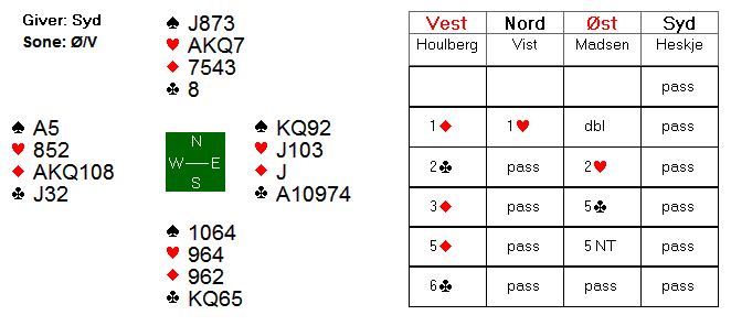 Jeg synes syd har tømt hånden sin etter å ha gått på med 5 kløver, og når nord går ned i 5 spar, har man ikke til annet enn pass. Det så ut til å bli et norsk tapspill, da motspillet har 2 ess å ta for.