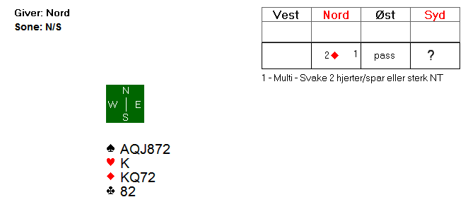 Din makker har åpnet 2 ruter multi i 1. hånd ugunstig. Hva ville du meldt på syd sin hånd?