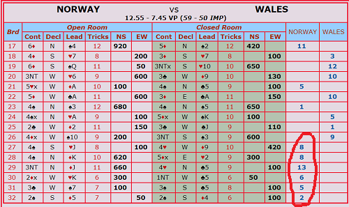 Etter 10 IMP inn på det første spillet, har det meste gått i Norges disfavør etter det. Etter 10 av 16 spill ligger vårt lag i åpen klasse under hele 17-50 mot Wales. Vi får håpe det snur i siste del av kampen. I et seriespill er hvert vinnerpoeng viktig. Det innebærer at det er viktig å få meg seg så mye poeng som mulig fra hver eneste kamp, også når man taper.