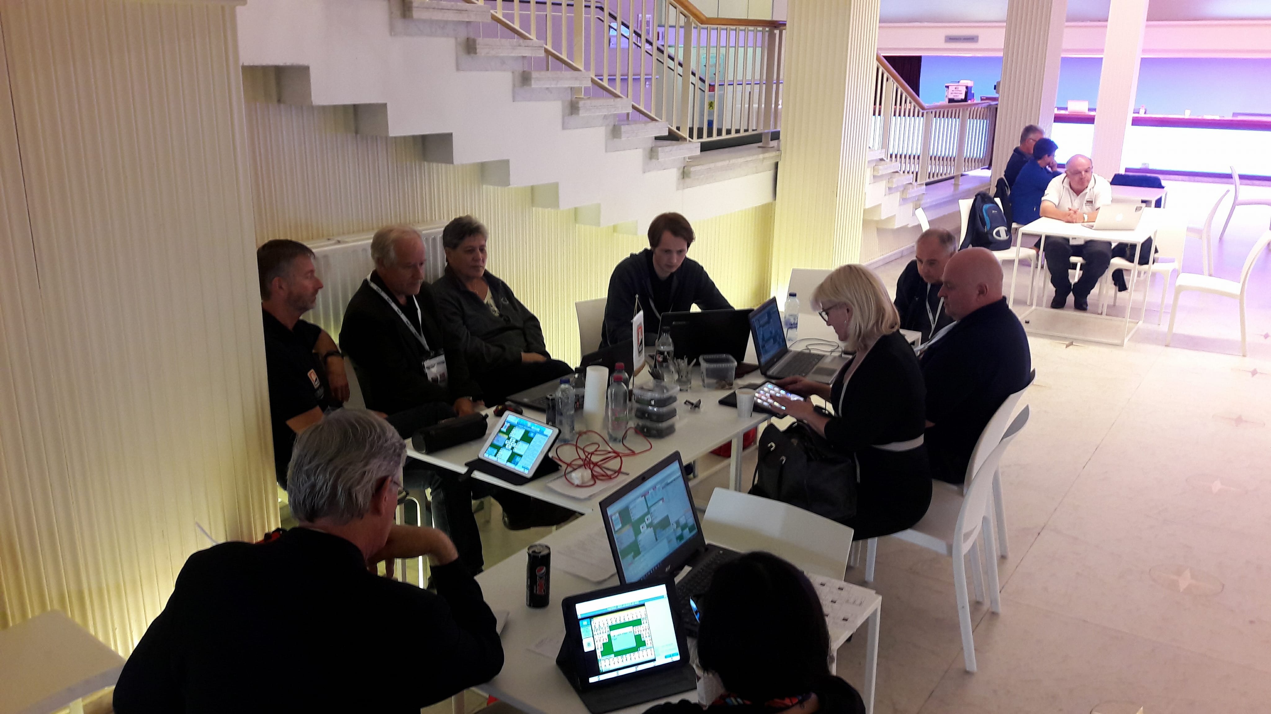 I skrivende stund er dagens siste kamp godt i gang. To av Norges lag overføres på BBO. I åpen klasse møter Norge Monaco (med Geir Helgemo og Tor Helness). I dameklassen møtes Norge og Danmark. I veteranklassen møtes også Norge og Danmark, men denne kampen overføres ikke på BBO. Under kan du se noen bilder fra de norske BBO-oppgjørene.