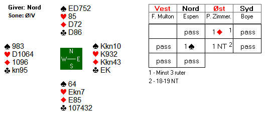 Så spilte vest en kløver mot bordet, og Espen la liten i tempo, og spillefører la liten, slik at knekten i syd tok stikket. Boye kunne nå spille liten hjerter tilbake, før Espen innkasserte de to siste stikkene for K9 i kløver over bordets Q8. 300 ga Norge 6 imp, mot 1NT med en beit på andre bordet.