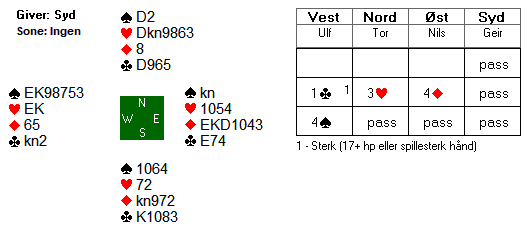 Noen spill senere var det godt spill for slem øst-vest. Tor Helness gjorde imidlertid livet surt for Ulf og Nils da han hoppet inn med 3 hjerter over Ulfs sterke kløveråpning: