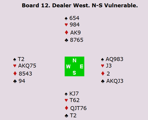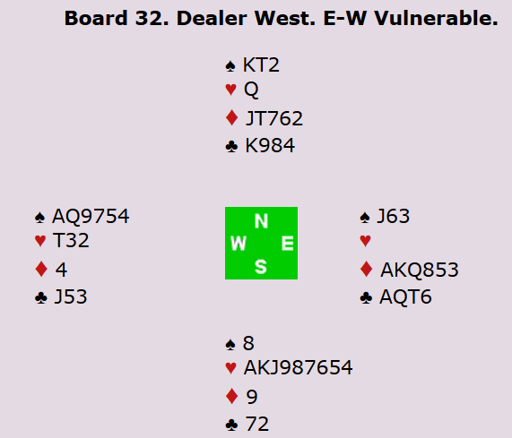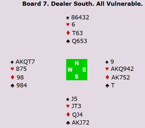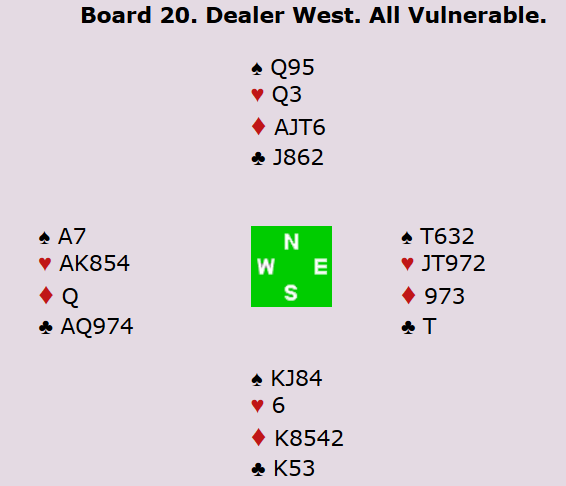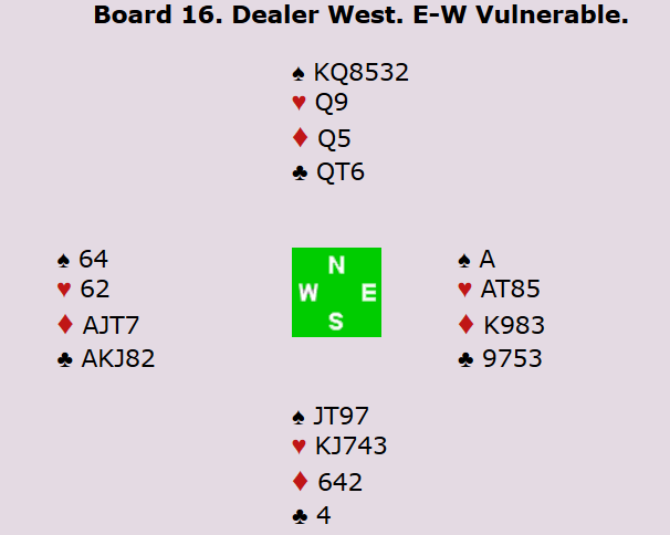 For veteranene spilte Peter hjem 4 spar på syds hånd. For å vinne den litt hardmeldte utgangen må man gjøre riktig i ruter og finne hjerter knekt. Ved det andre bordet fikk øst-vest spille 3 kløver med to beit, og dermed ble det 8 IMP til Norge. I åpen klasse stoppet Boye og Espen i 3 spar med ti stikk, men det ble likevel stor gevinst til Norge da Allan og Terje fikk spille 2 ruter doblet med overstikk øst-vest! Dobbeltscore er alltid fint.