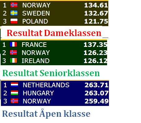 Åpen klasse: Norge - Kroatia:12,55 - 7,45 Norge - Finland: 16,26 - 3,74