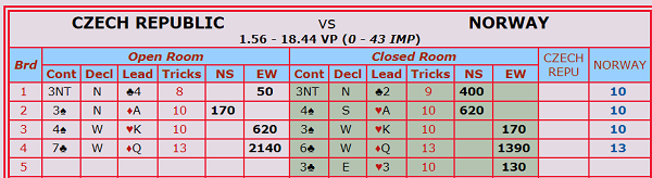 I den norske leiren ble det spøkt med 160-0 seier til Norge, etter 10 på de tre første, men så ble det forandring i mønsteret med 13 IMP til Norge.. :)