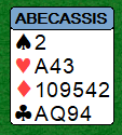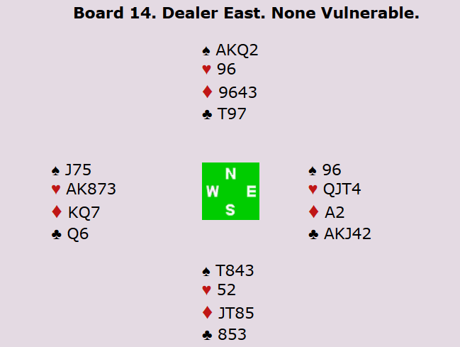 Etter at syd hadde fått et kløverstikk, kom øst inn og skulle trekke ut trumfen i 6 hjerter. I stedet for å starte med en hjerter honnør, mistet øst en liten hjerter i bordet!