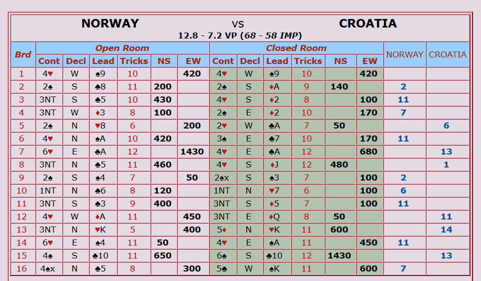 I dagens første kamp mot Kroatia kan du i artikkelen under lese om et spill der Norge tapte 13 IMP der Kroatia meldte en slem Norge ikke meldte: