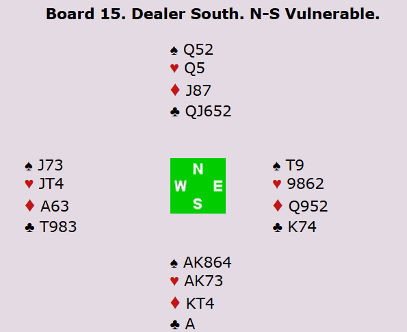 Spill 15 bekreftet mistanken om at kroatene melder gjennomført hardt. Her meldte de seg opp i slem igjen. Det var mye som skulle ordne seg, men det satt sannelig som det skulle. Trumfen må sitte 3-2, ruteren må løses til en taper og man må i tillegg få stjålet en hjerter i bordet før trumfen er ute. Kontrakten har med andre ord ikke stor sjanse for å gå hjem, men denne gang gikk det bra. Dermed 13 IMP til Kroatia i stedet for 13 til Norge, som det ville blitt dersom det var beit. Boye og Espen spilte 4 spar ved det andre bordet.