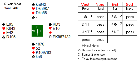 Tor var nok litt heldig som fant makker med ruter ess. Da var det enkelt å telle til 13 stikk i grand. Men hva om han ikke hadde hatt ruter ess? Da ville det blitt vanskelig å få kontroll på at det likevel sto 7 kløver. Det hadde vært enda sikrere å hoppe til 4 ruter som exclusion blavkwood.