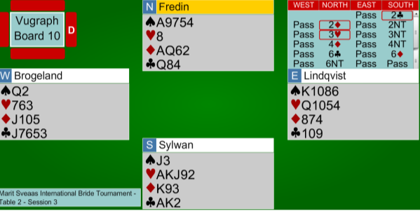 //Meldingsforløpet viser at det det svenske topp-paret vet hva de driver med. Syd viste en sterk NT og benektet 3 kort støtte i spar da han meldte 3NT på overføringen til spar. 4ru var en sleminvitt i i ruter som Sylwan avslo med 4NT. Fredin var ikke ferdig og stod på direkte til slem samtidig som han foreslo en tredje farge som trumf. Sylwan prefererte til 6 ruter og her tok Fredin seg en god tenkepause før han la kontrakten i 6NT.
