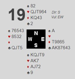 Jeg valgte 2 kløver. Det gikk dobler fra syd og 3 kløver fra vest før nord introduserte hjerterfarge. Du melder da selvsagt 5 kløver, men så sier N/S 5 hjerter og 6 hjerter! Vest doblet. Melder du 7 kløver nå? Det kan være riktig, men også veldig feil om du har et par-tre rutertapere og kanskje ikke en gang 6 hjerter står. Det ble til at N/S fikk spille 6 hjerter doblet. Slik så hele spillet ut: