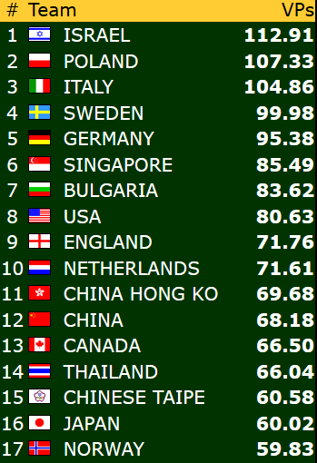 Norges U16-lag hadde en bra dag med to storseire, én knepen seier og ett knepent tap. Etter å ha sanket 54 vinnerpoeng i løpet av fire kamper er laget oppe på femteplass idet det gjenstår fem runder, og har i underkant av 17 VP ned til den røde streken (de åtte beste lagene går videre til sluttspill). I morgen venter en tøff dag med kamper mot Frankrike (3.plass), USA (4.plass), Israel (9.plass) og Kina 2 (7.plass).