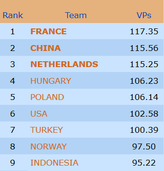Jentelaget vårt sanket 25 VP i løpet av tre kamper i dag. Etter ni av 15 runder holder laget den viktige åttendeplassen, men har ikke mer enn drøyt to vinnerpoeng ned til Indonesia på plassen bak.