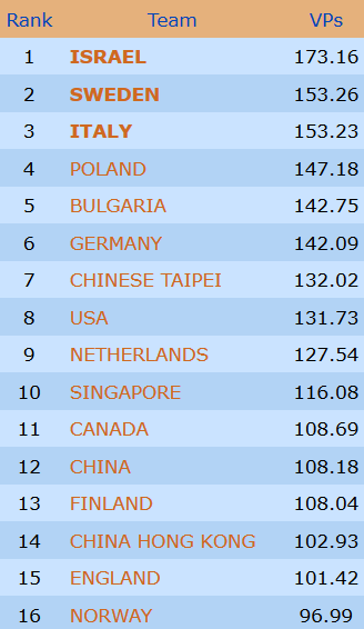U16 (18 lag deltar): Norge - Sverige 7,10 - 12,90 Norge - Taiwan 18 - 2 Norge - Kina 3 11,05 - 8,95 Norge - Danmark 17,86 - 2,14