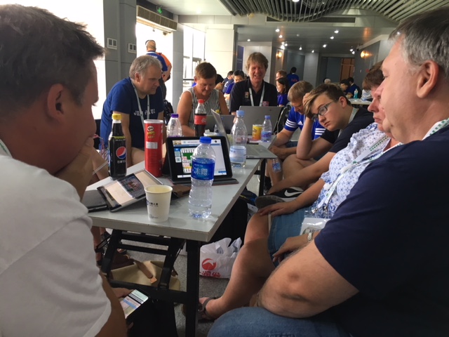 Den norske delegasjonen i Kina har sitt eget bord utenfor spillesalen hvor de følger utviklinga tett. (Begge foto: Kristin Osen)