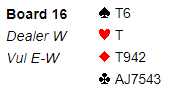 Selvsagt burde makker som satt med tre korts spar tatt ut i 6 grand samme hva slags kort hun satt med, for fra hennes ståsted kunne det godt mangle ett ess. Men hun tok ut i 7 ruter! slik så hele spillet ut: