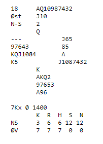 Det står i både 6 spar og 6 grand N/S, +1440 for grandkontakt, men det er vel ganske naturlig at man heller spiller sparkontrakt siden ruter"stopperen" er mildt sagt dårlig. Par-score (teoretisk maks resultat med maks innsats fra begge sider) er 7 kløver doblet av Ø/V, -1400.