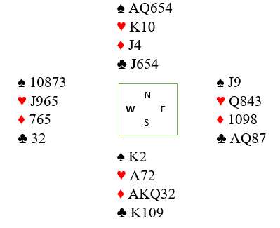 Våge (syd) oppvurderte syds gode 19-poenger til en 20-21 grand. Det var greit at makkren da tok en konservativ "view", han overførte til spar og foreslo kun 3 grand som ble kontrakten. Riktignok er ikke slem så dårlig, om kløverfinessen går bra er det svært gode sjanser.
