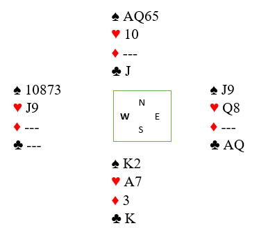 Våge vant nok et kløverstikk og det ville vært tretten enkle om både spar og ruter hadde gitt full uttelling. Som du ser sitter sparfargen 4-2, så det er fortsatt "kun" tolv stikk. Et lite forsvar for østs feil i det andre kløverstikket er at det kan han se ikke er tilfelle, sparfargen sitter ikke rundt. Men Våge hadde fått den hjelpen han trengte. Fortsettelsen ble halvmeteren med ruter, og før den siste så det slik ut: