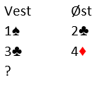 Meldingen startet de fleste stedene 1 spar – 2hjerter, eller 1 spar – 2 kløver som jeg synes er mest korrekt. Uansett finner vel de fleste tilpasningen i kløver, enten med det samme (etter 2 kløver-svar), eller i neste melderunde.