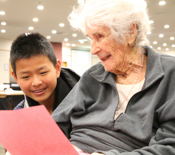 Ryan Song (14 år) og Enid Tower (100 år) diskuterer spill på Enids bursdag som ble feiret med å spille bridgeturnering!