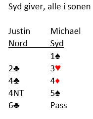 Knut åpnet med 1 hjerter, pass fra Tone Annette og 2 hjerter fra May Liss (V) som Øst etter pass fra Nord løftet til 4 hjerter. Det var normal kontrakt bortsett fra to par som fightet på 5- trinnet i minor, 5 kl x og 5 ru x. Disse gikk henholdsvis 3 og 2 bet men billig stamp og utgang imot står.