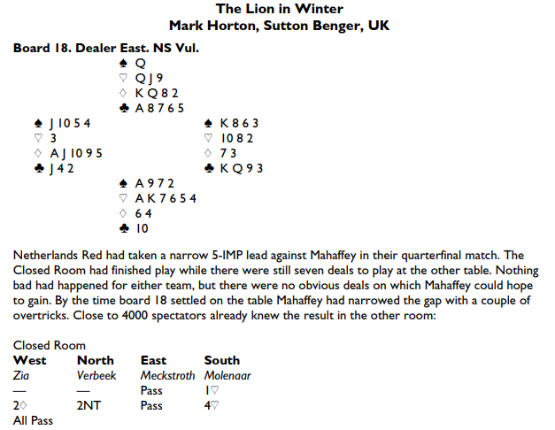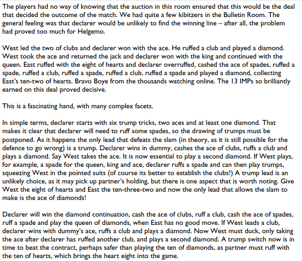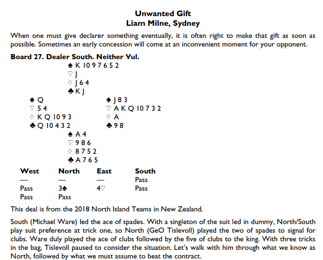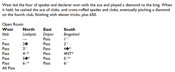 Og her er spillet som Liam Milne skrev om på Bridgewinners, og som så ble nominert til beste motspill i 2018: