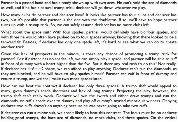 Som nord hadde jeg åpnet med 3 spar og øst gikk inn med 4 hjerter. Starten på motspillet var spar ess fra syd, toeren fra nord som Lavinthal, og syd skiftet til kløver ess og mer kløver til kongen, øst fulgte to ganger, så forsvaret har allerede tre stikk. Hva ville du gjort nå: