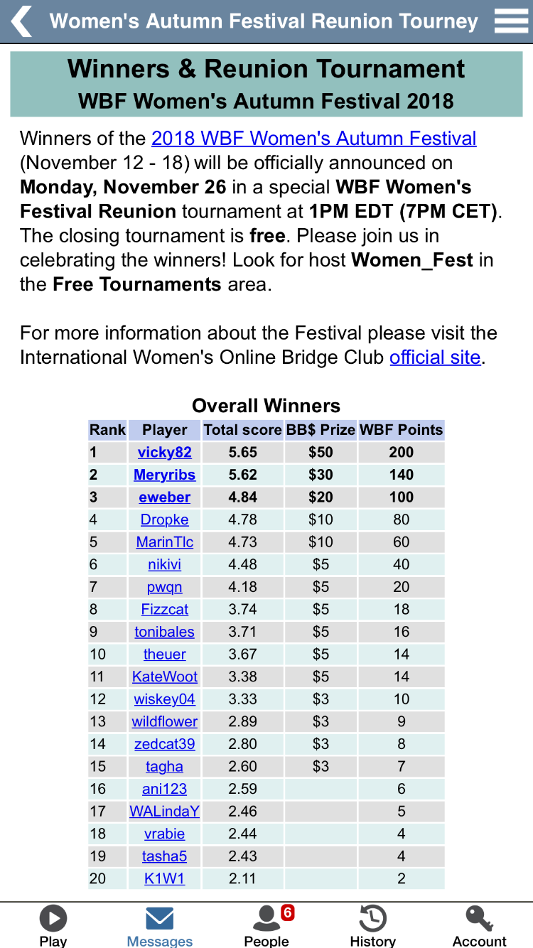 Men den seieren gikk hun også til tops i VERDENSRANKINGEN FOR ONLINE DAMEBRIDGE..