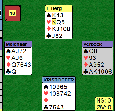 Der Berg-Kristoffersen satt N/S var Berg ganske sprekt med og doblet opplysende med nords kort, og syd fikk vist hjerter. Da vest ble spillefører i 3 grand spilte Berg ut hjerter. Da ble det med den grusomme rutersitsen for vanskelig for den nederlandske spilleføreren. Han gikk en bet, +100 til Norge. Kontrakten burde nok ha blitt vunnet uansett, men han fikk det så vanskelig som mulig. De fleste andre steder slet spilleførerne hjem 3 grand.
