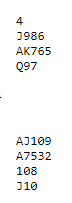 Det er ganske populært å åpne tynt, spesielt med to majorfarger. Hvis du åpner med 1 hjerter med dette havner du raskt i 4 hjerter, og det har du vel ikke så mye imot, for kortene må være bra i majorkontrakt når det er minst åtte trumf. Men la oss se på N/S sine kort først og spørre oss: er dette en god utgang?