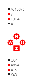Vel, syd satt med en helt flat grandhånd og 18 poeng. Men både nord og spesielt vest hadde fordelingsuhyrer. Vest med sin nikorts farge, to renonser og en sterk sidefarge ville naturlig nok ikke gi seg tidlig. Men nord meldte også aktivt flere steder, og med 6-5 i to farger og en makker som har sterke kort og tilpasning til begge fargene ville det normalt ikke være galt å melde endel. Men se på sitsen i N/S sine eventuelle kontrakter, med hjerter eller kløver som trumf. Hjerteren sitter 5-0 og kløveren 4-0!