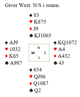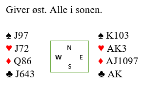 Og merk at om nord har spar ess så går det også bra med hensyn til inntak til vest. Nord stikker da med spar ess over nieren, og du legger elegant kongen under esset! Da må du få inntak til vest med spar kn-9 gjenværende mot 10-x på hånden.