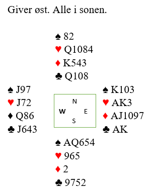 Dette er et eksempel på hvor viktig det er å ta seg en liten pause før du spiller på til det første stikket. Du er desperat etter å komme deg inn på vest sin hånd så du kan få tatt ruterfinessen. Merk at utenom spar konge er dine mellomspar (knekt, 10 og 9) likeverdige, det spiller ingen rolle for sparstikkene som sådan hvilken av de sparene du spiller på først og sist.