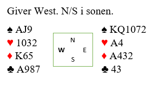 For å sikre deg inntak til vest bør du forlange spar 9 i første stikk. Hvis du sover i timen og legger spar 7 (det ser jo med hensyn til sparfargen som sådan litt uvesentlig ut hva du gjør) dekker nord med åtteren og du blir låst på østs hånd. Idet nord kommer inn på ruter konge kommer spar gjennom, og syd tar fire sparstikk og beten.
