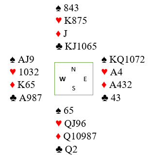 Hvis nord har singel ruter kan det gå bra om du sørger for at de ikke har overgang i hjerter. Hvis du stikker med hjerter ess og spiller ruter til kongen og ruter mot hånden kan nord med denne sitsen trumfe. Så kan han spille liten hjerter til syd og få nok en ruterstjeling. Du må i så fall senere få en kløvertaper også, og det blir en bet.