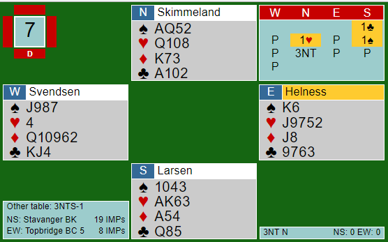 Vest spilte ruter ut, og da er det ikke så lett å vinne kontrakten selv om det selvsagt går an med åpne kort. I kampen mellom Stavanger og Topbridge 5 ble Topbridge sin syd spillefører i 3 grand og gikk bet. Tre andre spilleførere gikk bet i 3 grand, to av dem hvor syd ble spillefører.