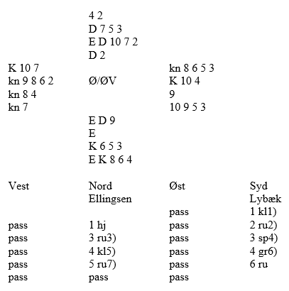 Etter tre runder trumf fulgte fire runder kløver til stjeling i bordet (kastet en spar på den tredje kløverrunden). Spar til esset og det siste kløverstikket ble innkassert. Vest forsaket seg. Da hun kastet spar ble spar dame stjålet god. 13 stikk. Det ga 82 % score.