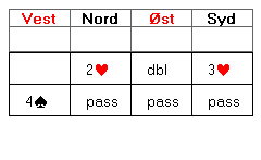Du er altså i ugunstig sone, og makker har doblet opplysende over 2 hjerter. Hva ville du meldt over 3 hjerter fra syd?