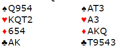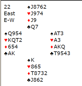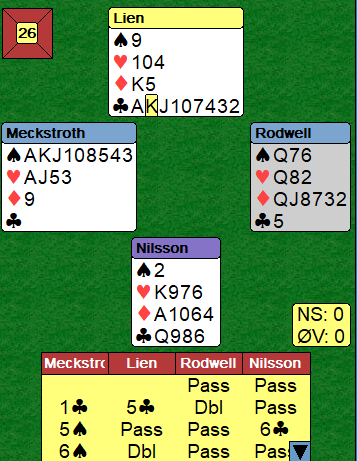 Høyland-Ekren var i 6 grand med øst som spillefører. Noe avhenger av utspillet. Hvis motparten spiller spar ut og det sitter slik at de får etablert ett stikk der må spillefører spille på at sparen gir tre stikk. Da kan det kanskje bli tolv med tre sparstikk, fire hjerterstikk, tre ruterstikk og 2 i kløver. Det er også en liten tilleggsjanse at en motspiller har Q-J dobbel i kløver, og det vil også være skvismuligheter i dette spillet.