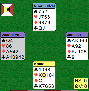 Mot Brogeland-Lindqvist spilte Ø/V 4 spar med tolv stikk. Kontrakten 6 ruter er ganske bra, det eneste så må ordne seg er at trumfen ikke gir taper. Det er forskjellige spilleplaner å velge mellom, men da Jansma lasjerte hjerterutspillet kunne han ikke gå bet lenger slik det satt, trumfen kom av seg selv siden damen satt singel. Han vant fem sparstikk, ett stikk i hjerter og kløver ess foruten fire trumfstikk = 11, pluss en hjerterstjeling på vest sin hånd.