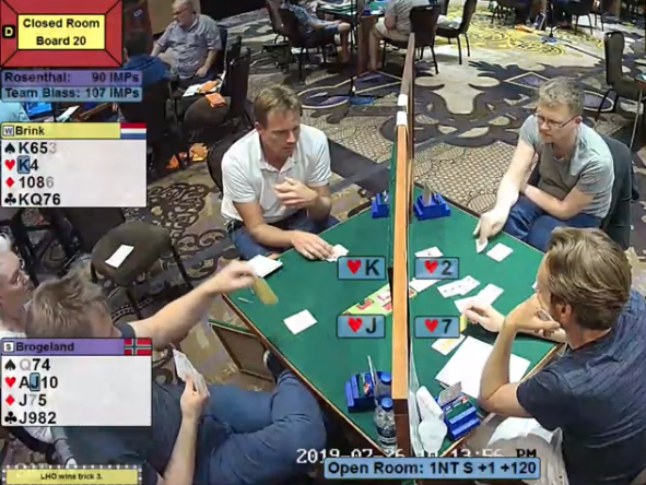 Brink-Drijver doblet imidlertid 5 kløver. Der var det to bet, +500, og dermed 4 IMP til ROSENTHAL som på dette tidspunktet lå kun 1 IMP under!