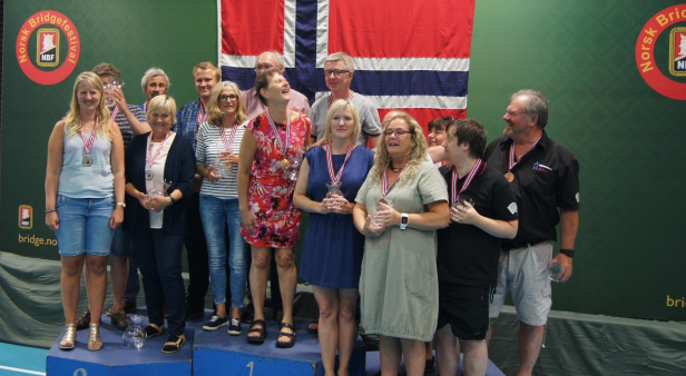 Lag S(h)aman med Anna Malinowski, Sam Inge Høyland, Åse Biribakken og Helge Mæsel hadde en fin ledelse før start i tredje og siste sesjon i NM for mixlag i Dramman. Siste sesjon ble spilt tirsdag formiddag. Og de holdt unna, seiersmarginen ble på vel 8 VP. Det er ikke noen soleklar seier, men de hadde ganske bra kontroll og vant til tross for et lite tap i siste kamp hvor de slik de andre resultatene var kunne tålt å tape større, men de spilte i den kampen mot bronselaget så det var mulige doble-svingspill som kunne blitt ubehagelige.