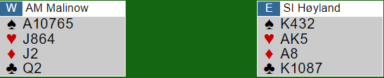Nå spilte Høyland spar ess og spar til håndens konge. Syd viste seg å ha trumfstikk (QJ9 fra start). Høyland tok for kløver 10 og kastet en hjerter. I det stikket trumfet syd og spilte hjerter 3.