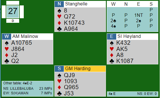 Ved det andre bordet kom hjerter 10 ut og spillefører forsøkte knekten med det samme. Da kløverfinesse med tieren senere ble forsøkt ble det en bet og 11 IMP til vinnerlaget.